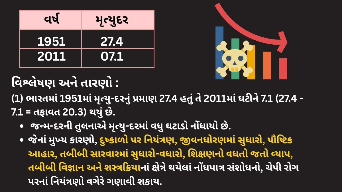 ભારતમાં મૃત્યુનો દર નીચો હોવા છતાં વિકસિત રાષ્ટ્રોની સરખામણીમાં આ દર હજુ ઊંચો જણાય છે. વિજ્ઞાનની મદદ વડે પ્રજનન તથા બાળ આરોગ્યને લગતી સેવાઓ તથા સવલતોમાં વધારો કરવો. રસીકરણની પ્રક્રિયાને સાર્વત્રિક તથા અસરકારક બનાવવી. 'એઈડ્સ' જેવી બાબતો અંગે જાણકારી વધારવી, અન્ય ચેપી તથા જાતીય રોગોના પ્રમાણમાં ઘટાડો કરવો આ પ્રકારનાં પગલાં મૃત્યુના દર તથા બાળમૃત્યુના દર નીચી સપાટીએ લઈ જઈ શકે તેમ છે.